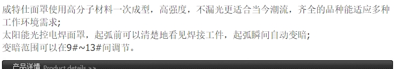 威特仕608.0002太陽能(néng)光控電焊面(miàn)罩電焊氣焊氩弧焊激光焊高清中文版接面(miàn)罩