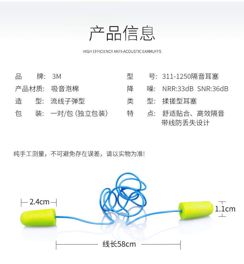3M311-1250耳塞 睡眠防噪音帶線耳塞 3M33分貝耳塞