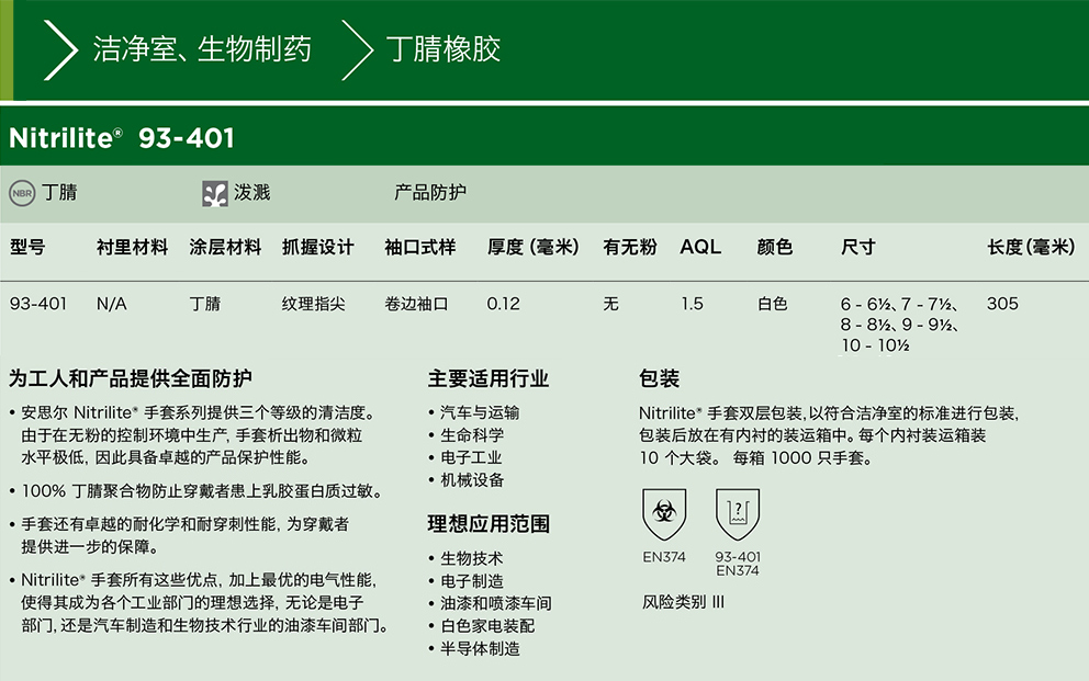 Ansell安思爾 丁腈手套抗靜電潔淨室防化學(xué)品飛濺手套93-401耐穿刺手套