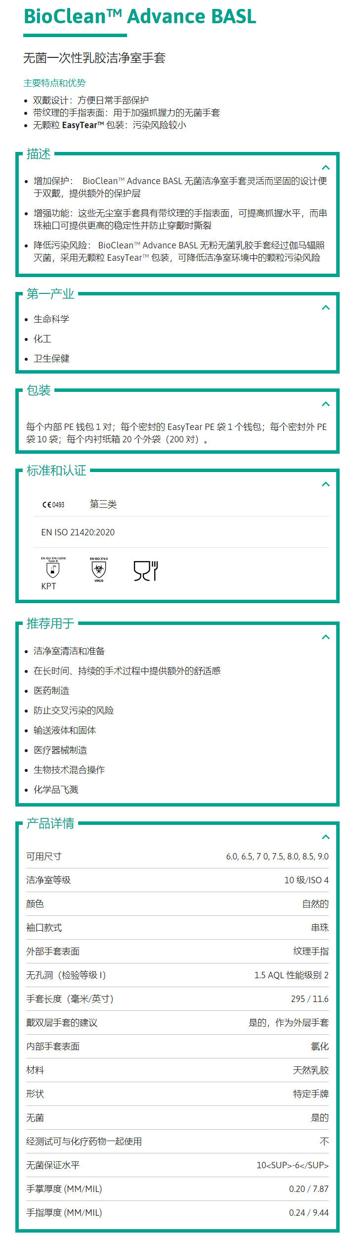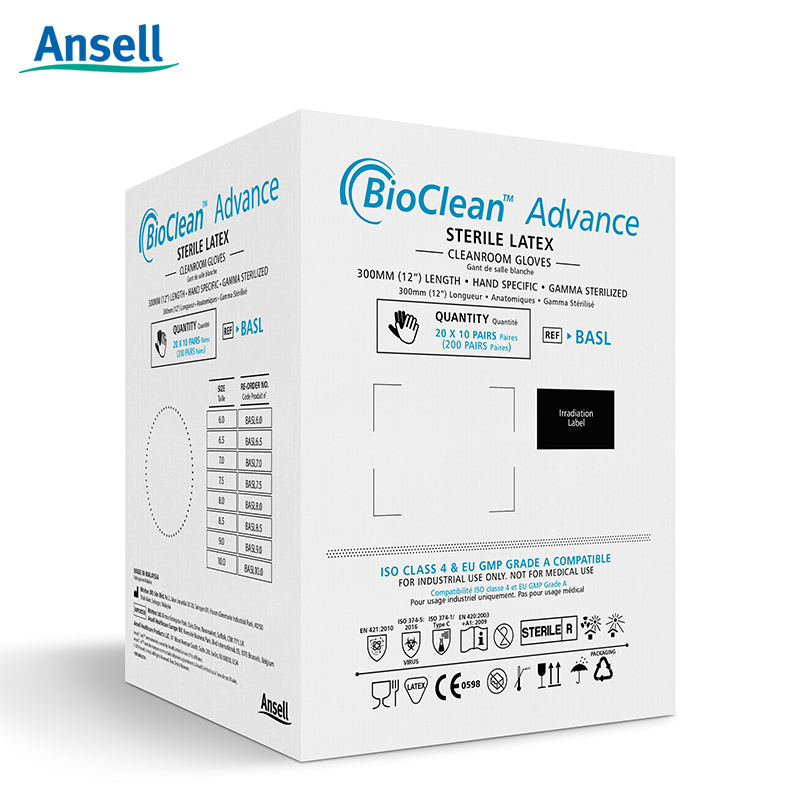 Ansell安思爾 無菌乳膠潔淨室手套化學(xué)品飛濺BAS視頻直播L防護手套